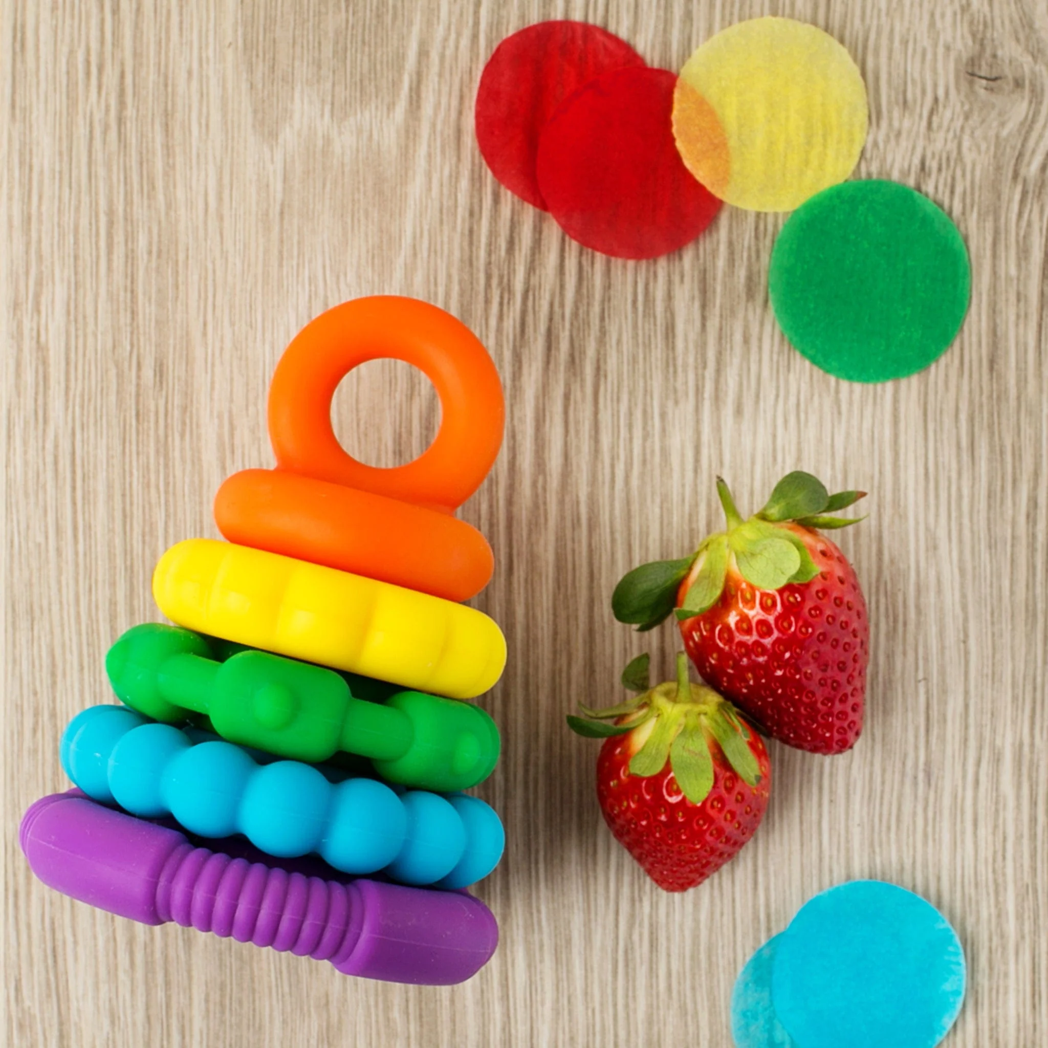 This teether and toy combined is multi purpose and suitable for all ages. For bubs it can be used as a teether and provides relief for tender gums. As your child gets older it can be used as a stacker toy to encourage hand eye co-ordination, creative thinking and problem solving skills. A fun and educational product that is safe, durable and quiet.