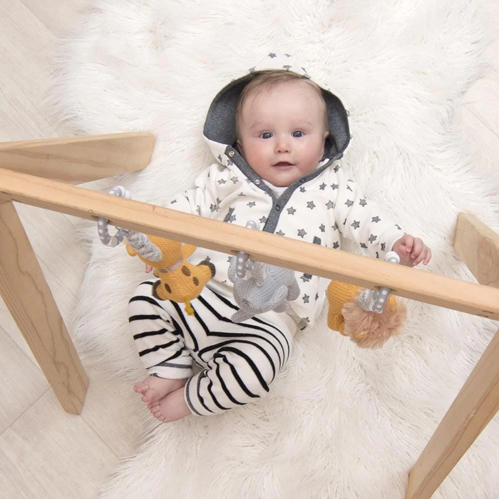 Keep baby entertained when out and about with our super sweet cotton knit stroller toys! Inspired by our Savanna Babies collection, these stroller toys can be attached to any stroller/pram hood , bumper bar or even baby's play-gym or car seat.